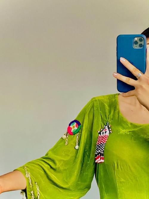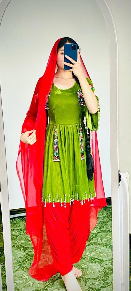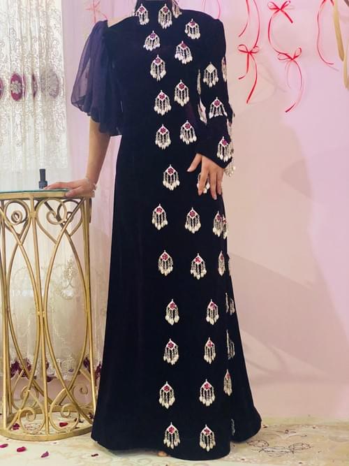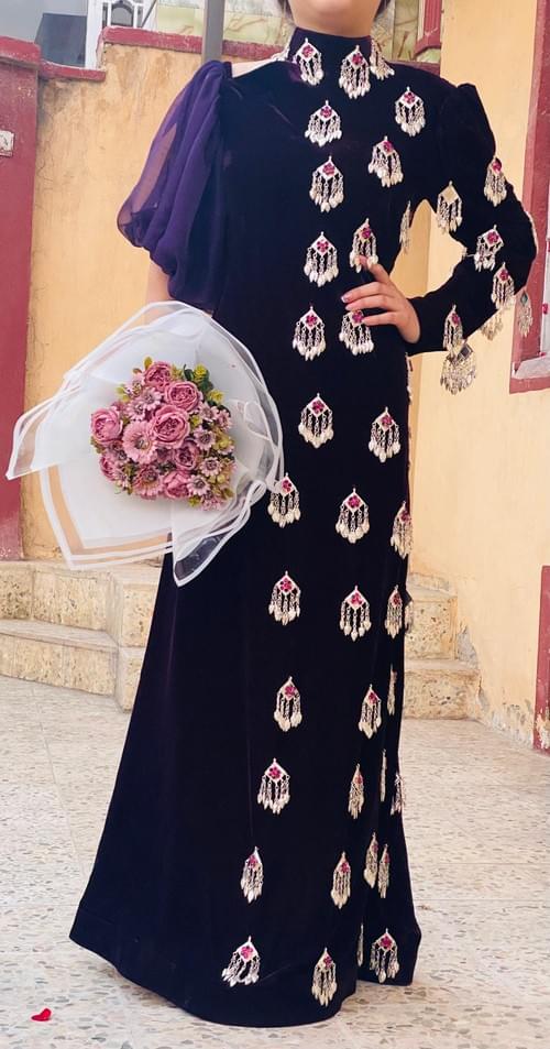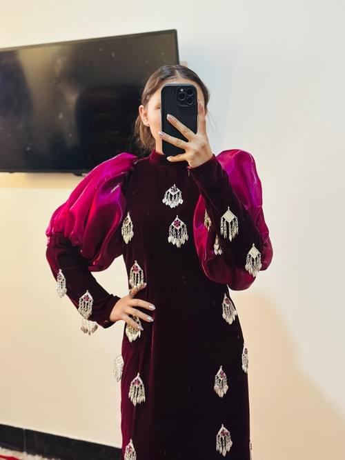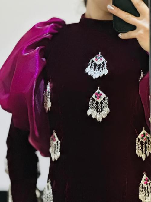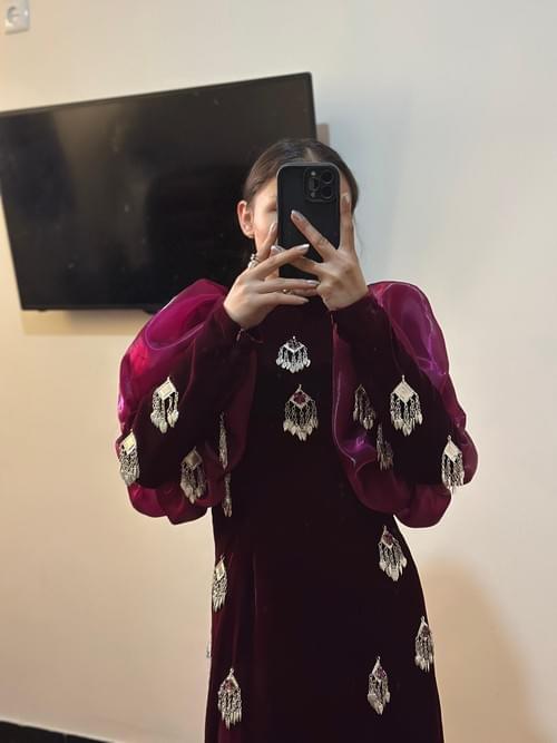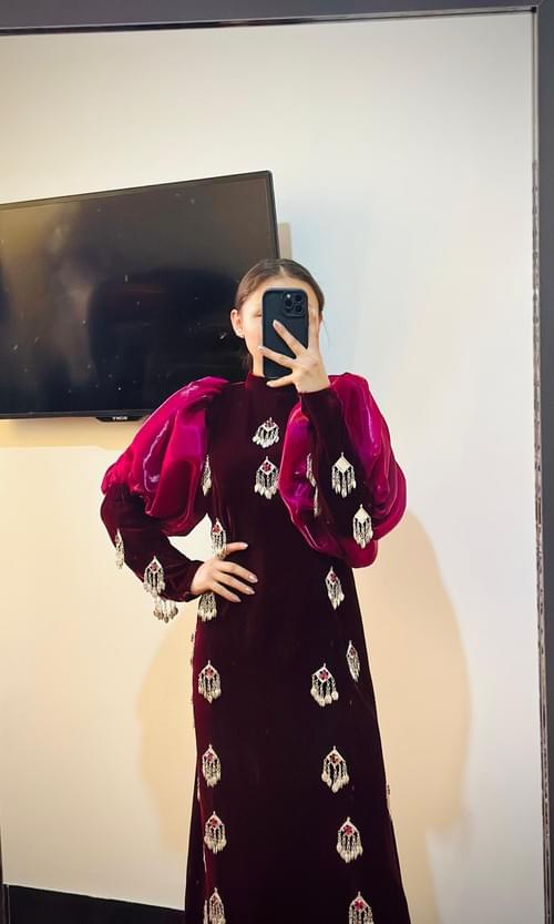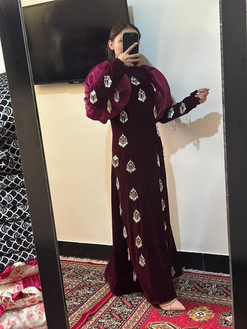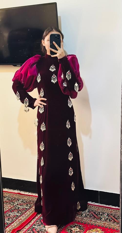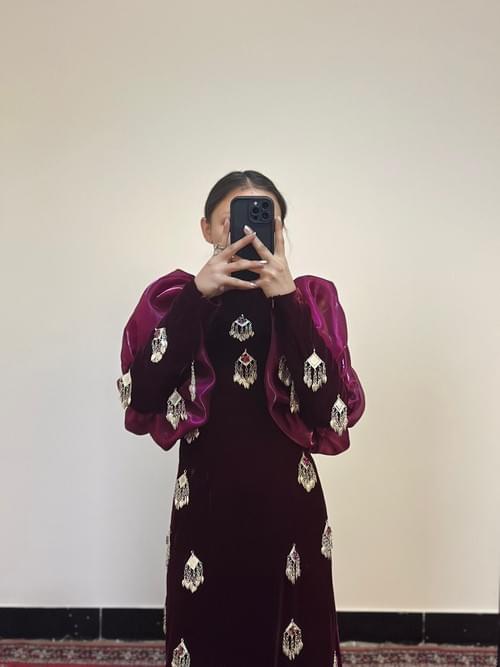 مخمل سبزِ زمردی، با آویزهای ظریف و مهرهدوزیهای چشمگیر، با شال سرخ روشن کامل میشود و استایلی میسازد که در هر محفل مثل شعلهای زیبا دیده میشود.QuantityComing soon