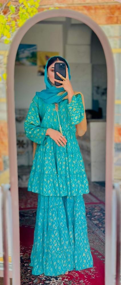 این ست با رنگ آرامِ فیروزهای و طرحهای لطیفش، حس قدمزدن کنار دریای آرام را زنده میکند. پارچهی سبک و خوشحرکت آن، استایلی راحت، شیک و دخترانه میسازد که برای محافل و مهمانیهای روزانه بهترین انتخاب است.
