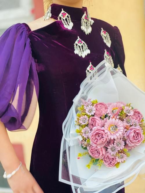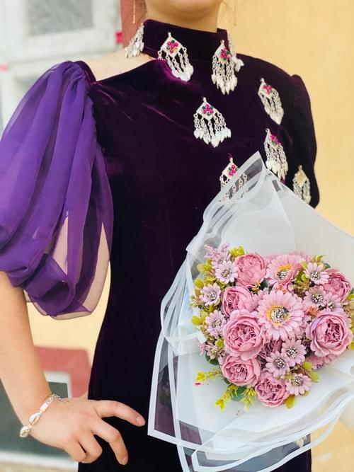 پارچهی مخمل لطیف با عمق رنگی دلنشین، حس گرما و شکوه شب را تداعی میکند و در کنار آن، آویز ظریف لباس مانند امضایی هنرمندانه جلوهای خاص به طراحی میبخشد.